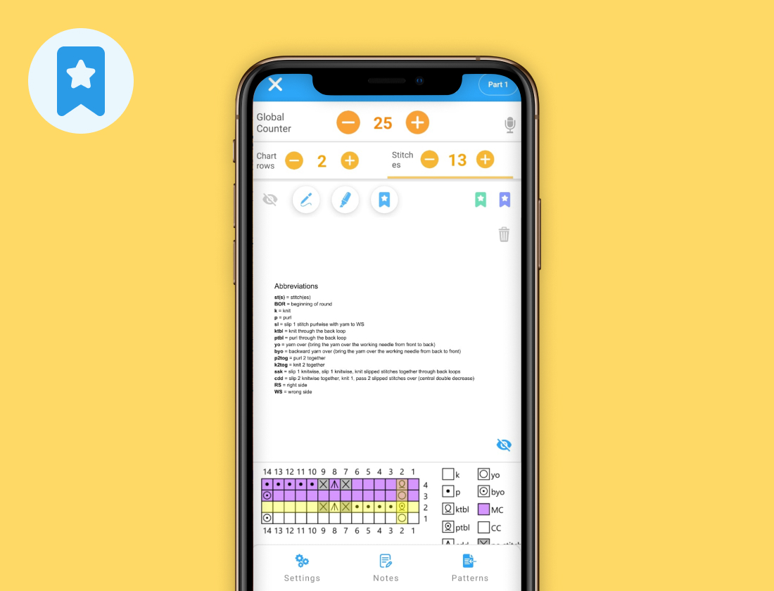 Du kannst jetzt bis zu 4 Lesezeichen zu deinem Projekt hinzufügen. Speichere wichtige Stellen aus einer Anleitung, einem Foto oder einer anderen Datei als Lesezeichen in deinem Projekt und blende sie nach Belieben ein oder aus. Besonders praktisch für Abkürzungslisten, Maschenmuster, oder Notizen, die du während des Arbeitens schnell griffbereit haben möchtest.